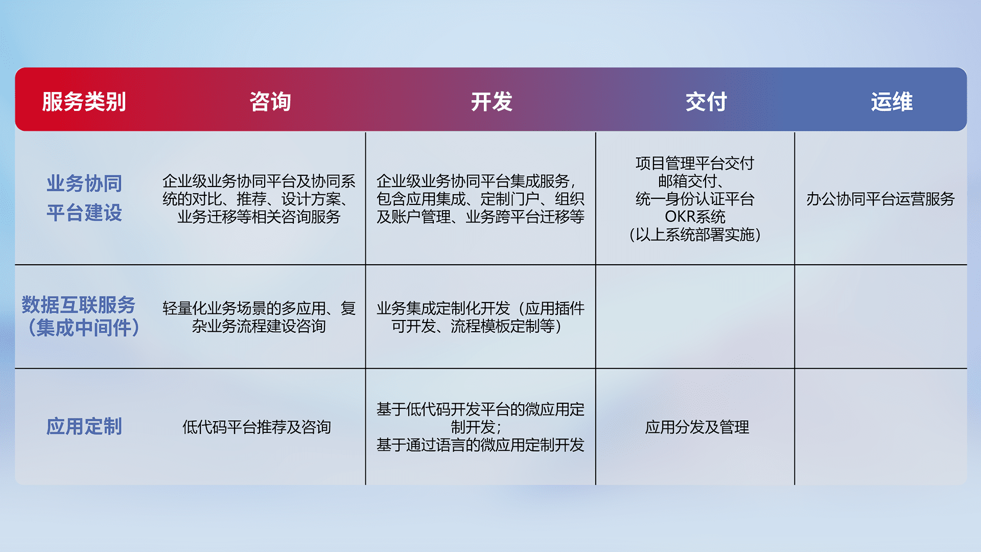 针对钉钉、、企微、、、、IDaas等平台级产品提供产品的规划、、、、方案、、交付、、、定制化开发等服务,,,实现如统一协同办公、、、智能客户服务、、混合会议管理、、、智能数据查询、、等业务场景,,,,实现数字化转型。。